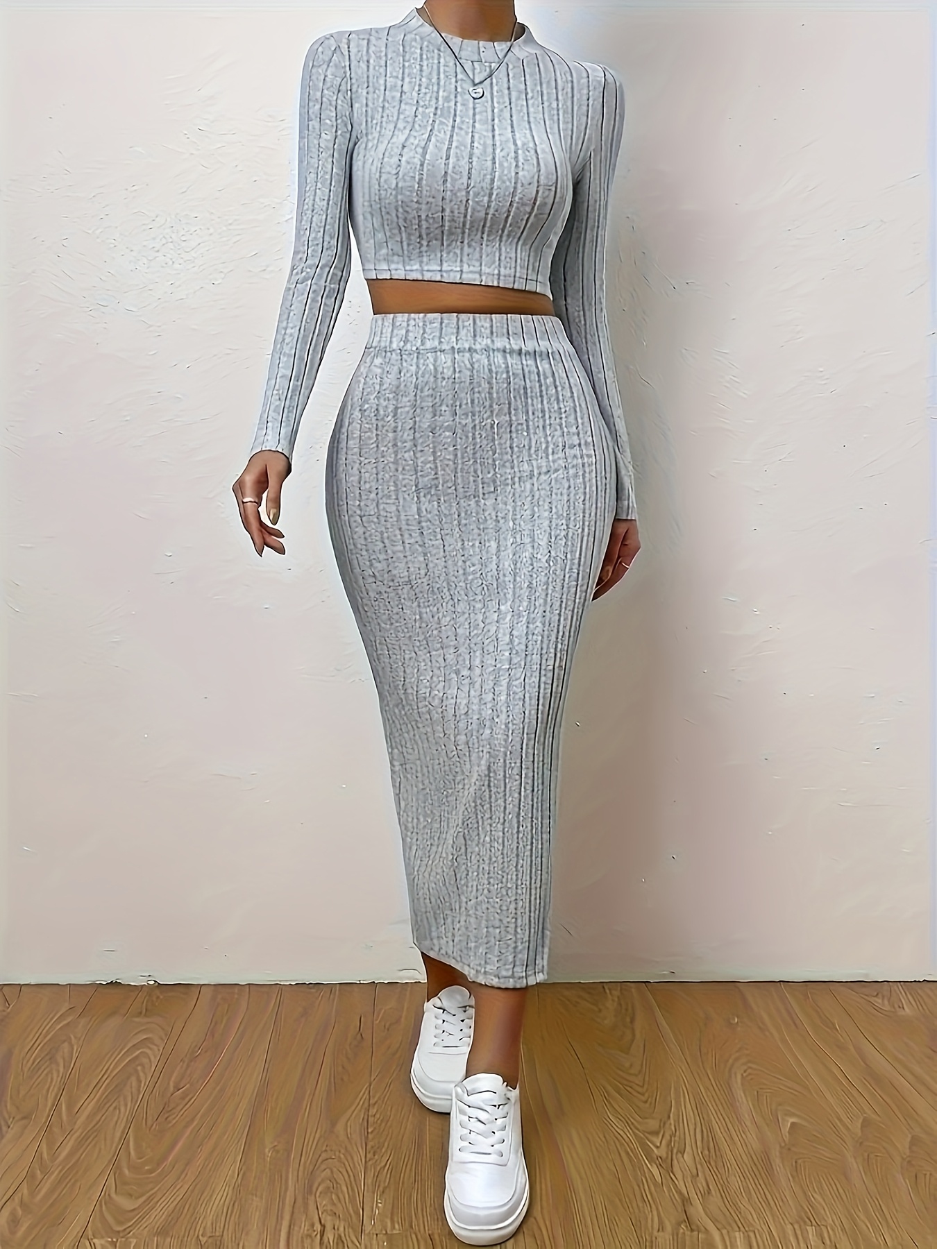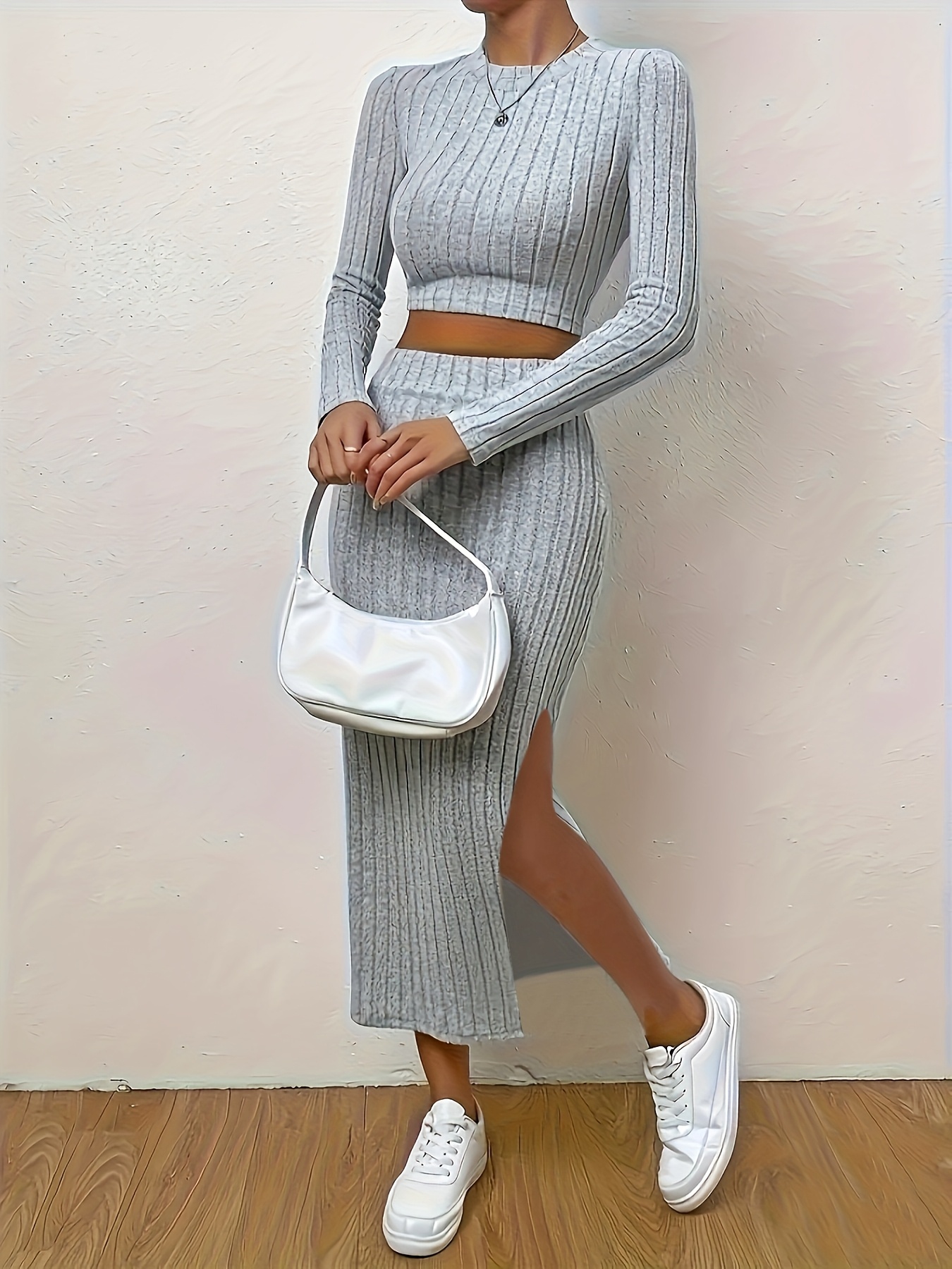 Conjunto casual elegante com manga comprida, gola redonda e fenda.